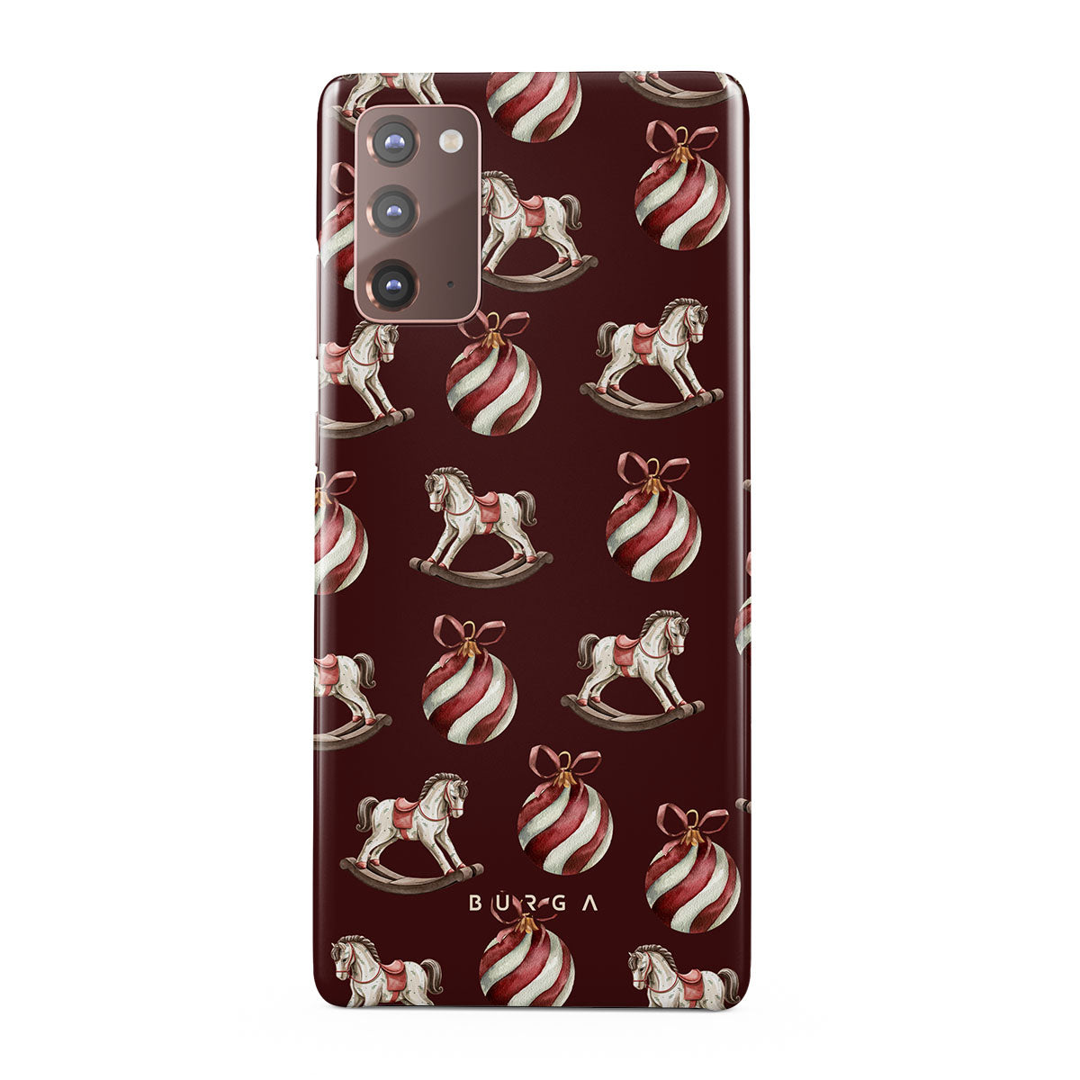 Elementi distintivi: cavallucci a dondolo, palline, rosso, decorazione natalizia