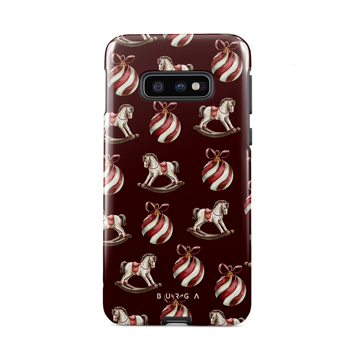 Elementi distintivi: cavallucci a dondolo, palline, rosso, decorazione natalizia