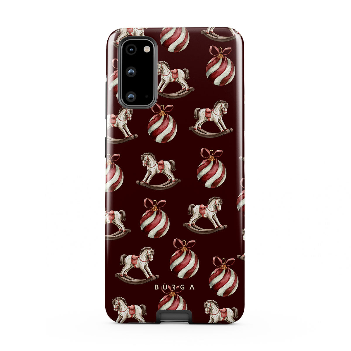Elementi distintivi: cavallucci a dondolo, palline, rosso, decorazione natalizia