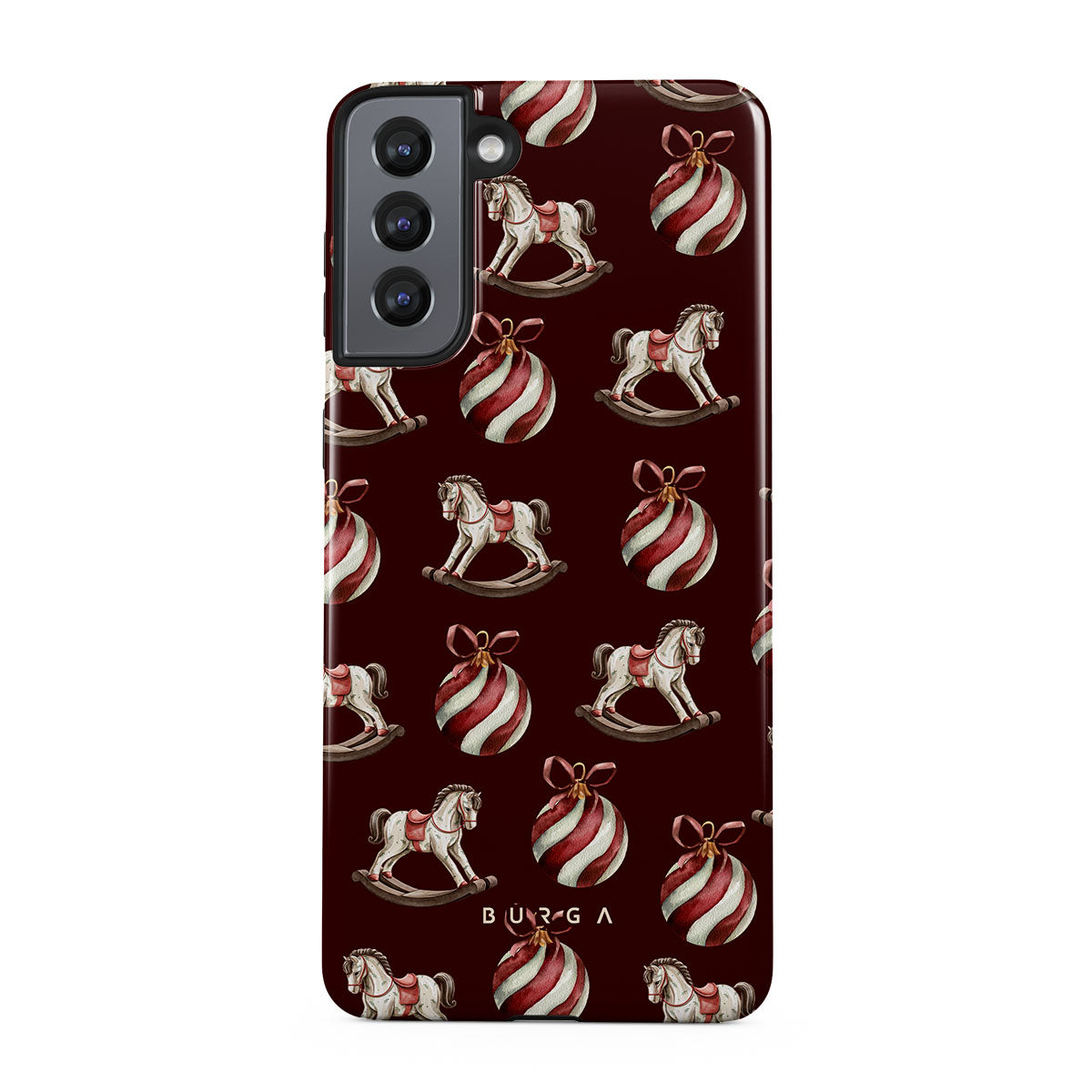 Elementi distintivi: cavallucci a dondolo, palline, rosso, decorazione natalizia