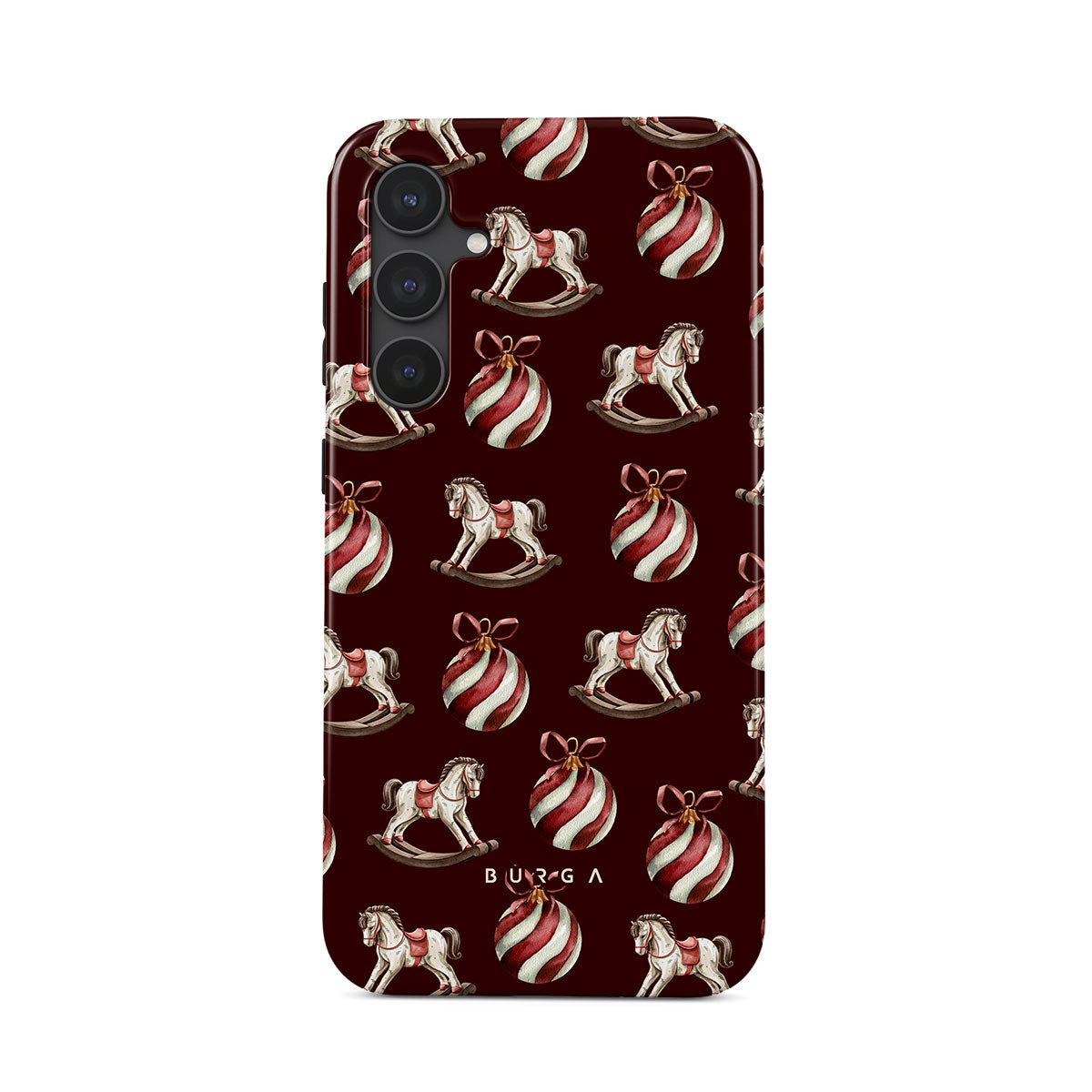 Elementi distintivi: cavallucci a dondolo, palline, rosso, decorazione natalizia