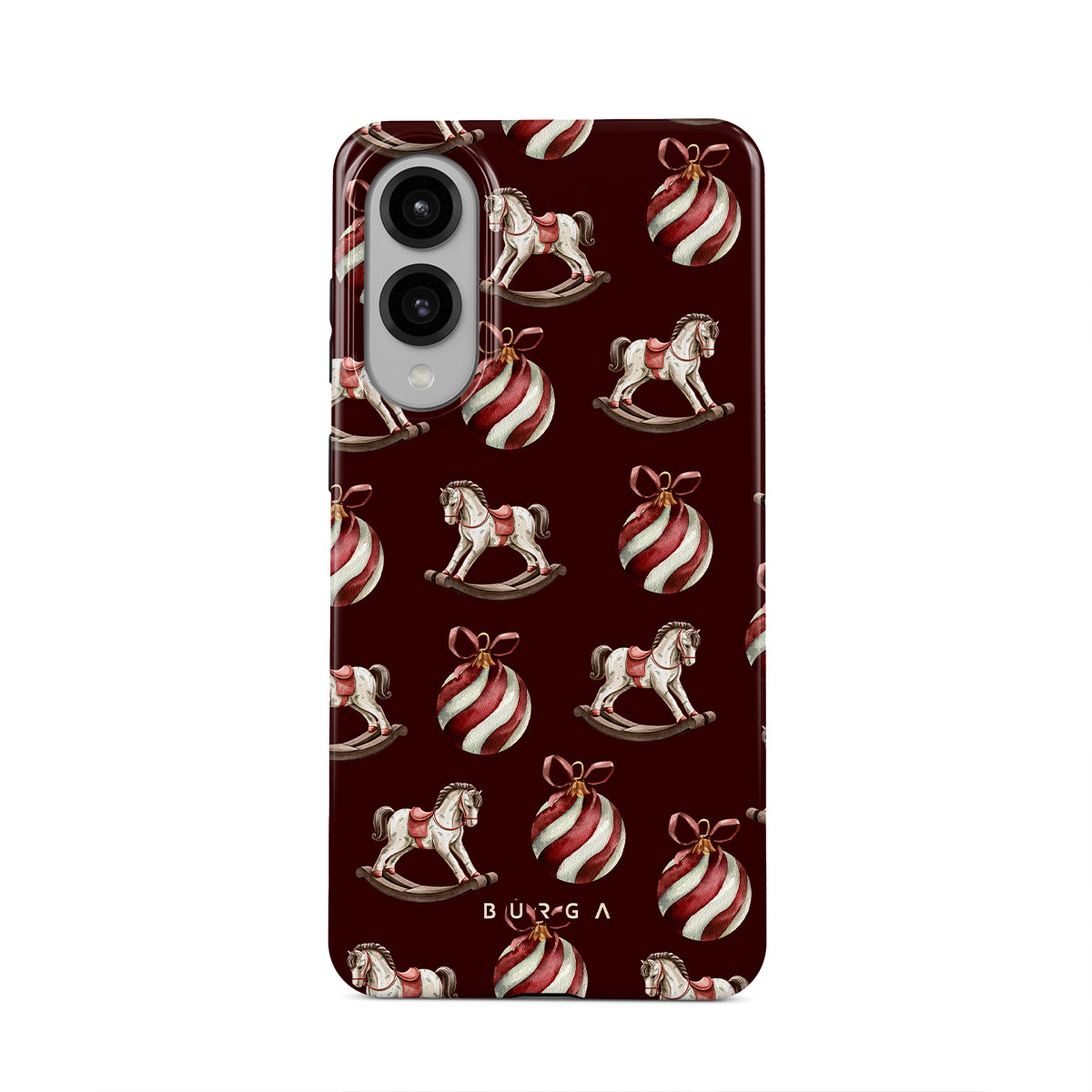 Elementi distintivi: cavallucci a dondolo, palline, rosso, decorazione natalizia