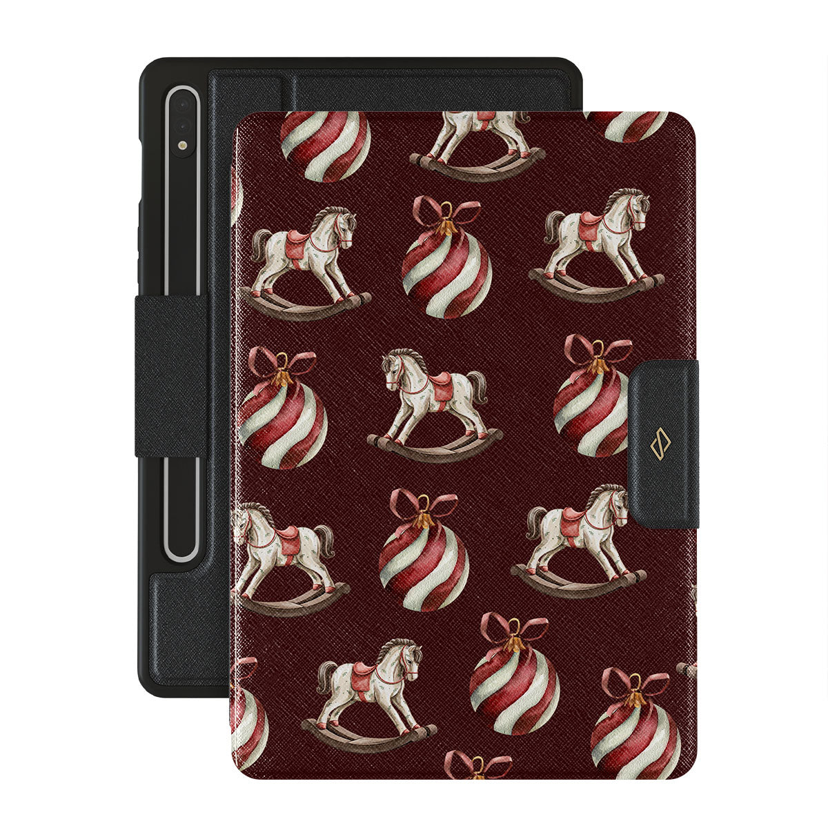 Elementi distintivi: cavallucci a dondolo, palline, rosso, decorazione natalizia