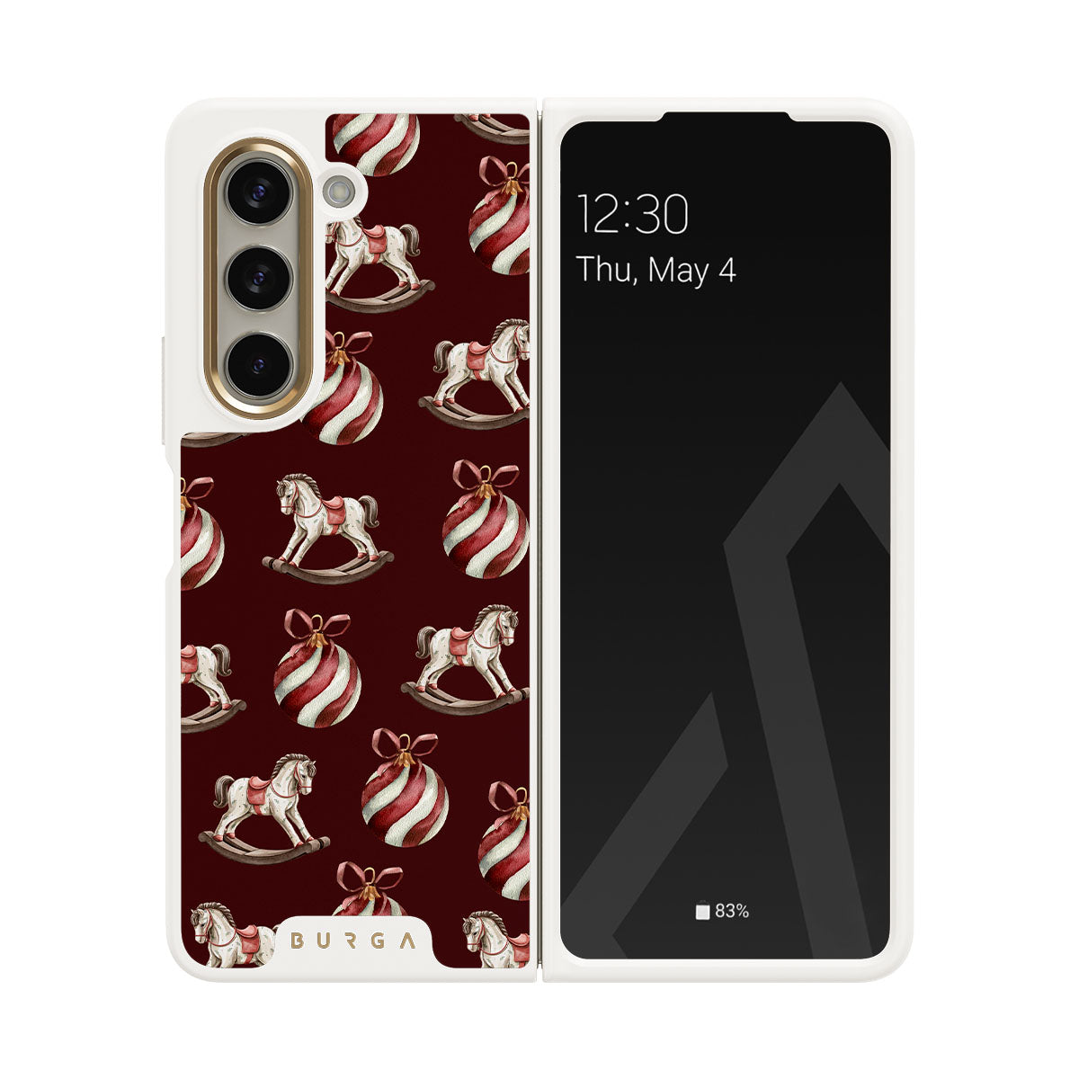 Elementi distintivi: cavallucci a dondolo, palline, rosso, decorazione natalizia