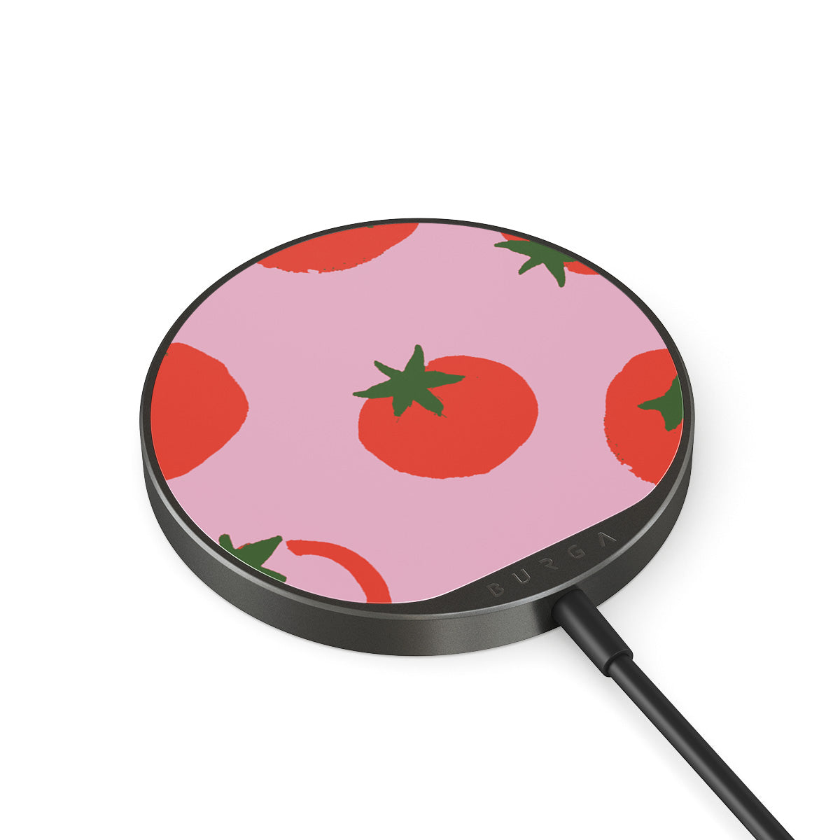 Questo design include: Pomodori, colori audaci rosso e rosa.