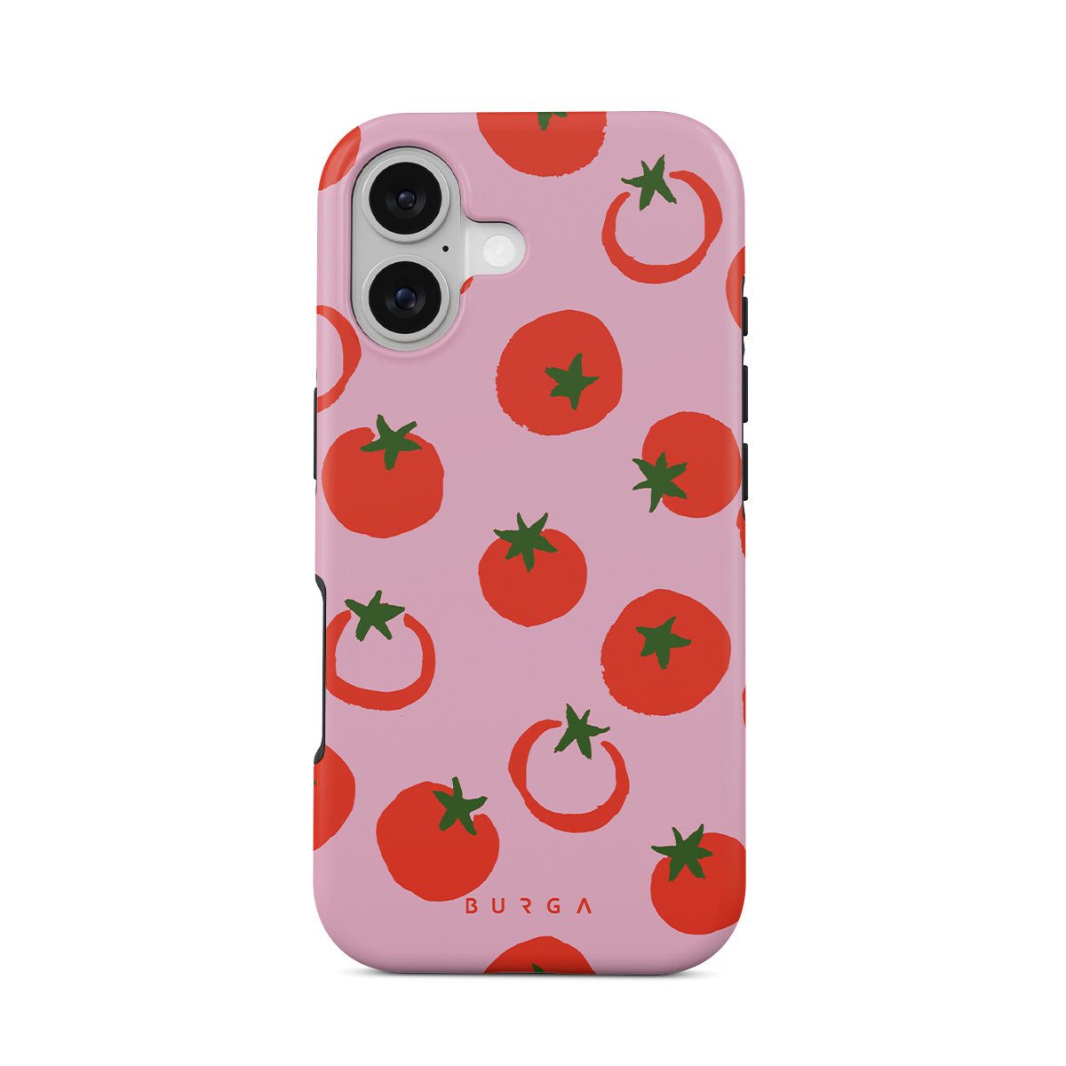 Questo design include: Pomodori, colori audaci rosso e rosa.