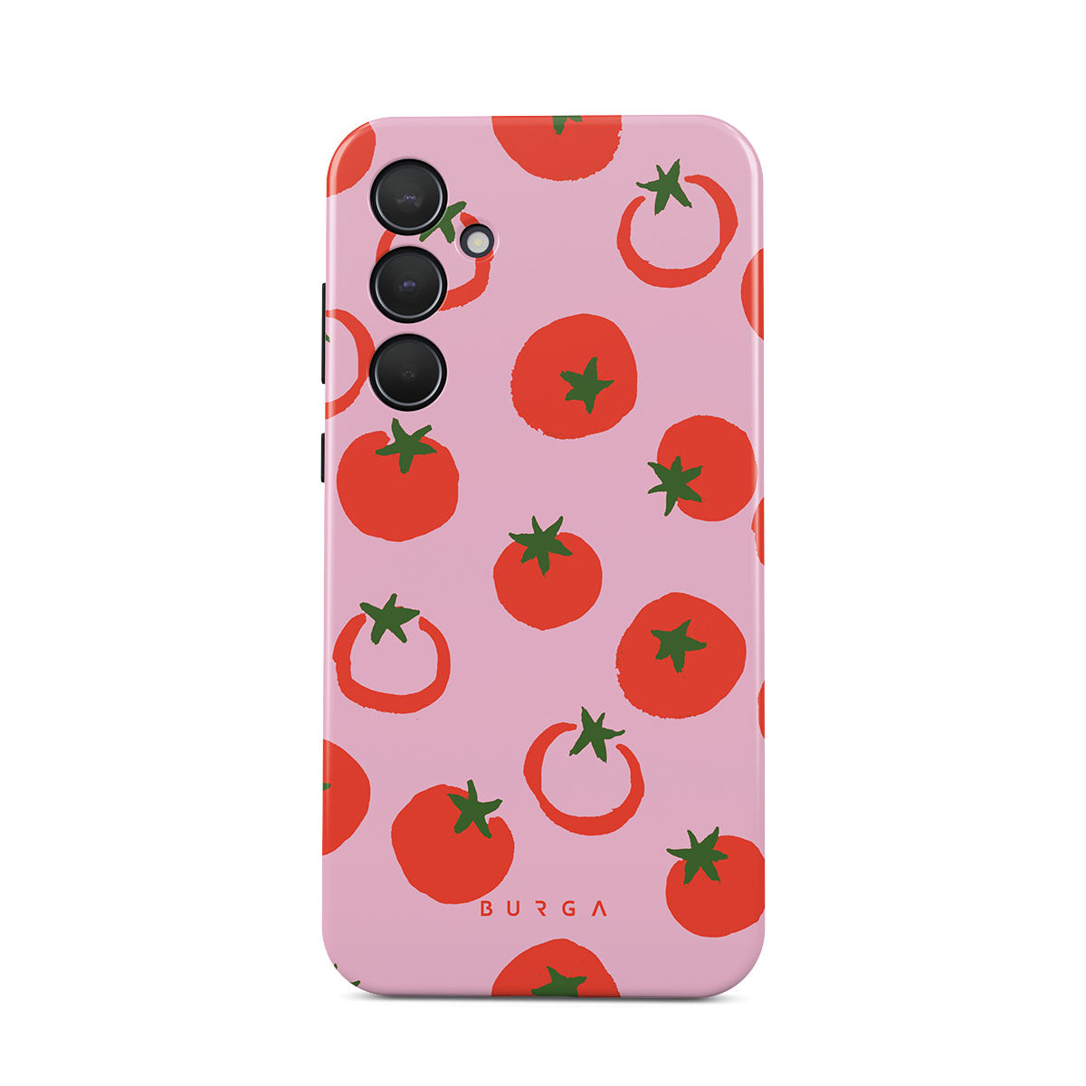 Questo design include: Pomodori, colori audaci rosso e rosa.
