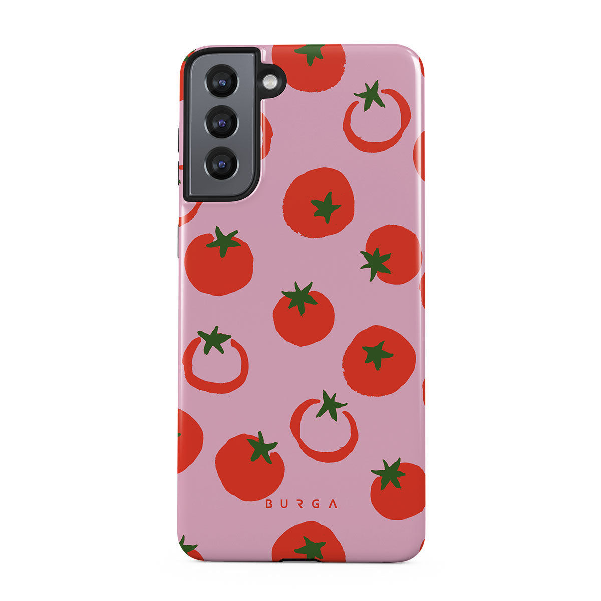 Questo design include: Pomodori, colori audaci rosso e rosa.