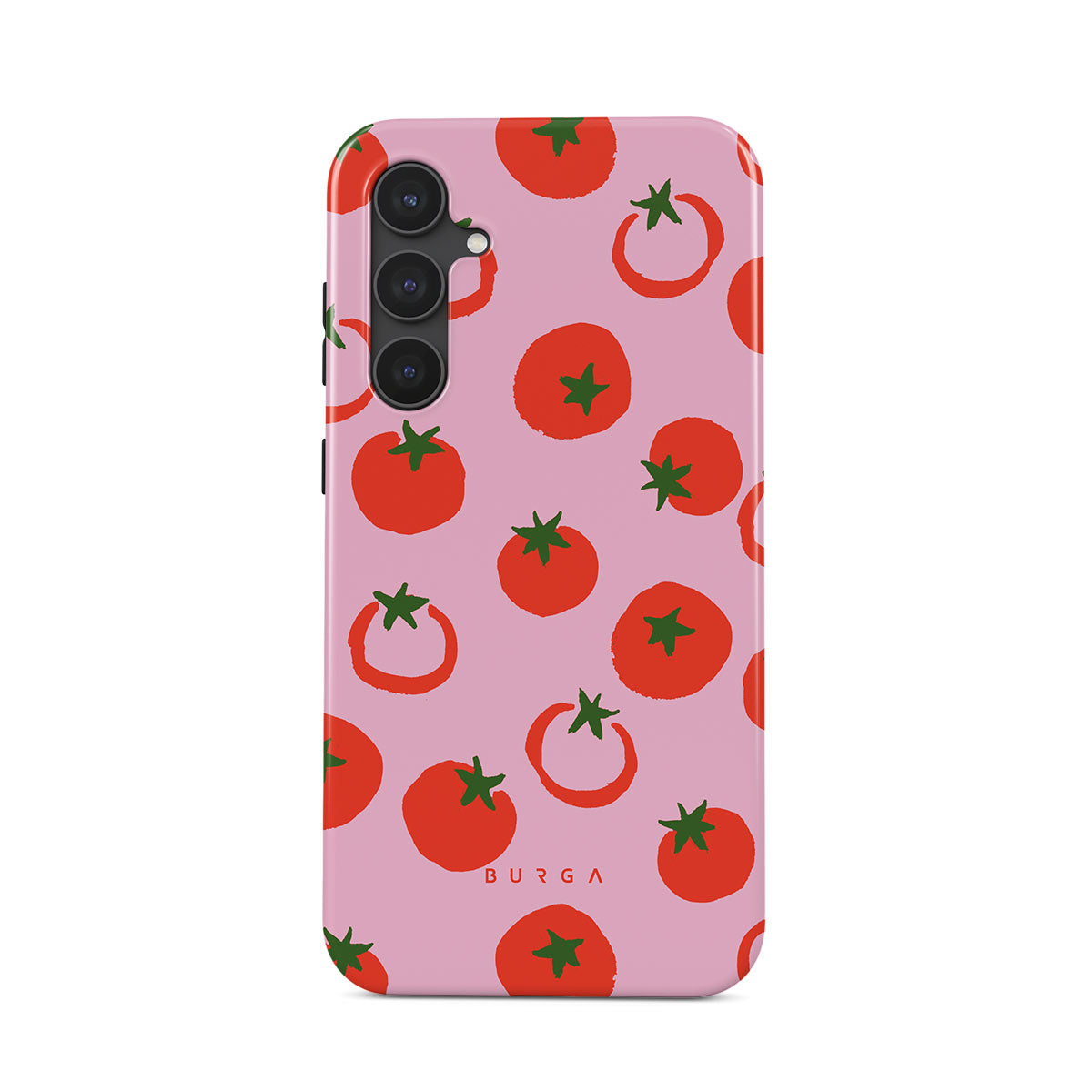 Questo design include: Pomodori, colori audaci rosso e rosa.