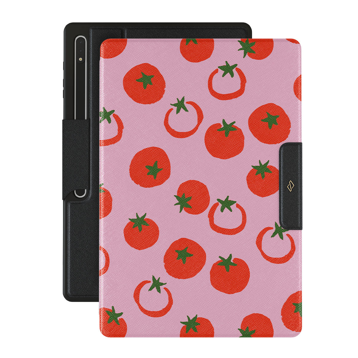 Questo design include: Pomodori, colori audaci rosso e rosa.