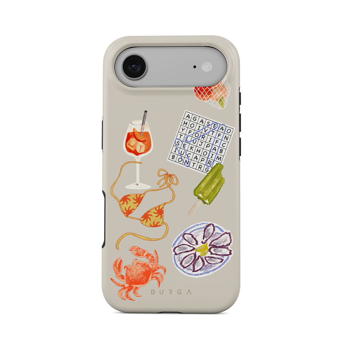 Questo design include: granchio, piatto di ostriche, ghiacciolo, cruciverba, cocktail spritz, top bikini, frutta.