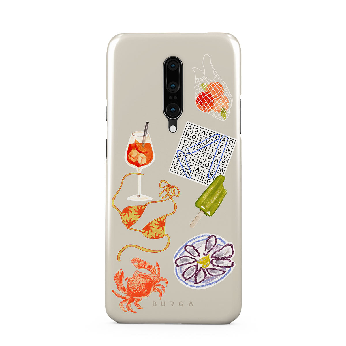 Questo design include: granchio, piatto di ostriche, ghiacciolo, cruciverba, cocktail spritz, top bikini, frutta.