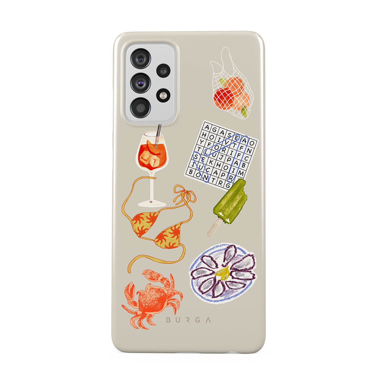 Questo design include: granchio, piatto di ostriche, ghiacciolo, cruciverba, cocktail spritz, top bikini, frutta.