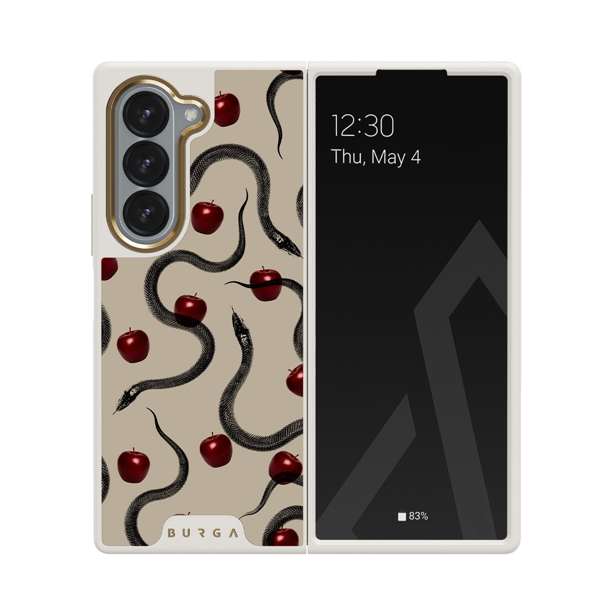 Questo design presenta: mele rosse lucide, serpenti attorcigliati, tonalità beige.