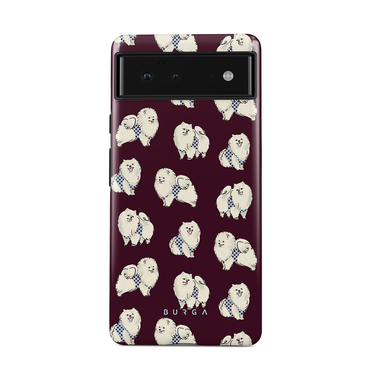 Questo design include: cani bianchi e soffici su uno sfondo bordeaux intenso, barboncini e animali domestici.