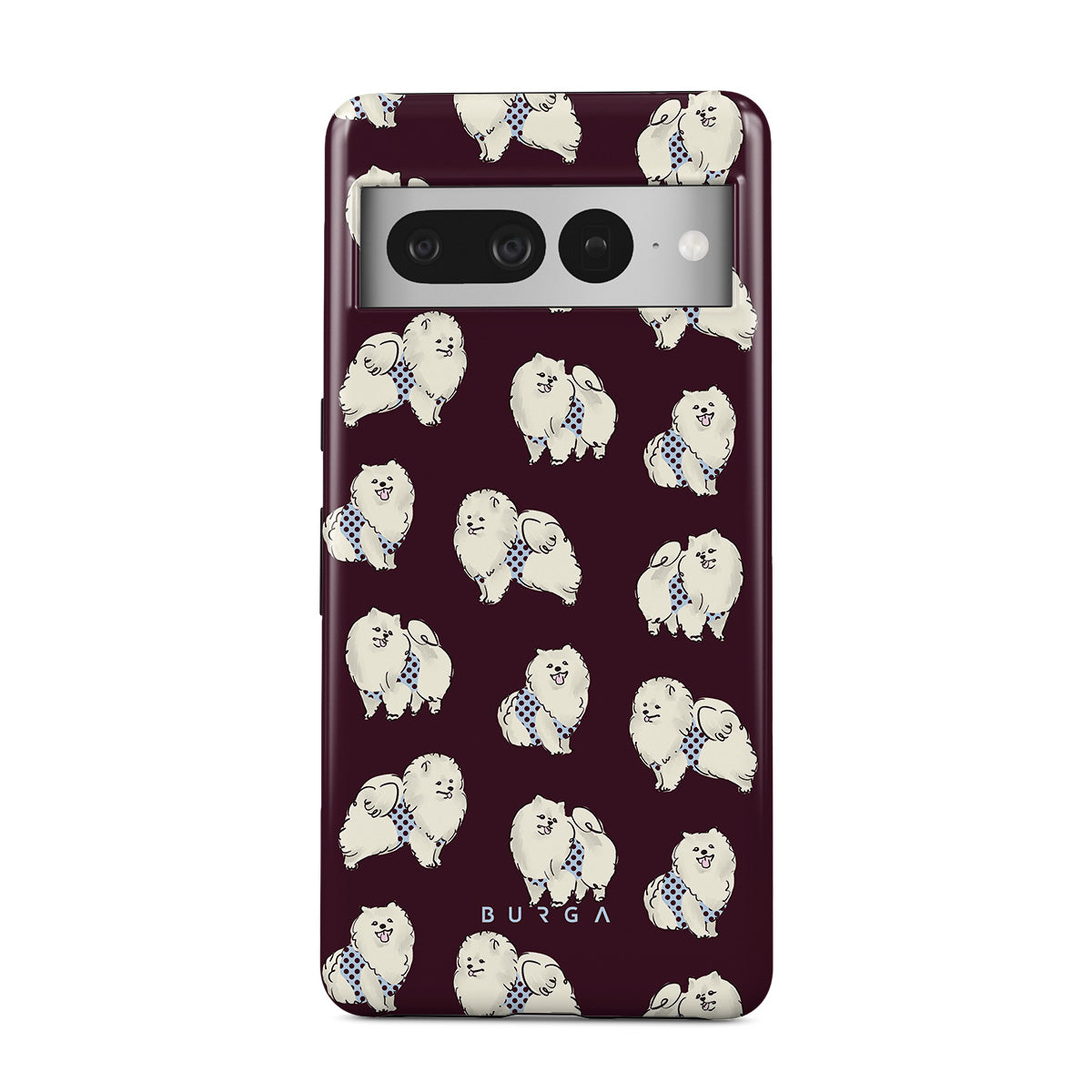 Questo design include: cani bianchi e soffici su uno sfondo bordeaux intenso, barboncini e animali domestici.
