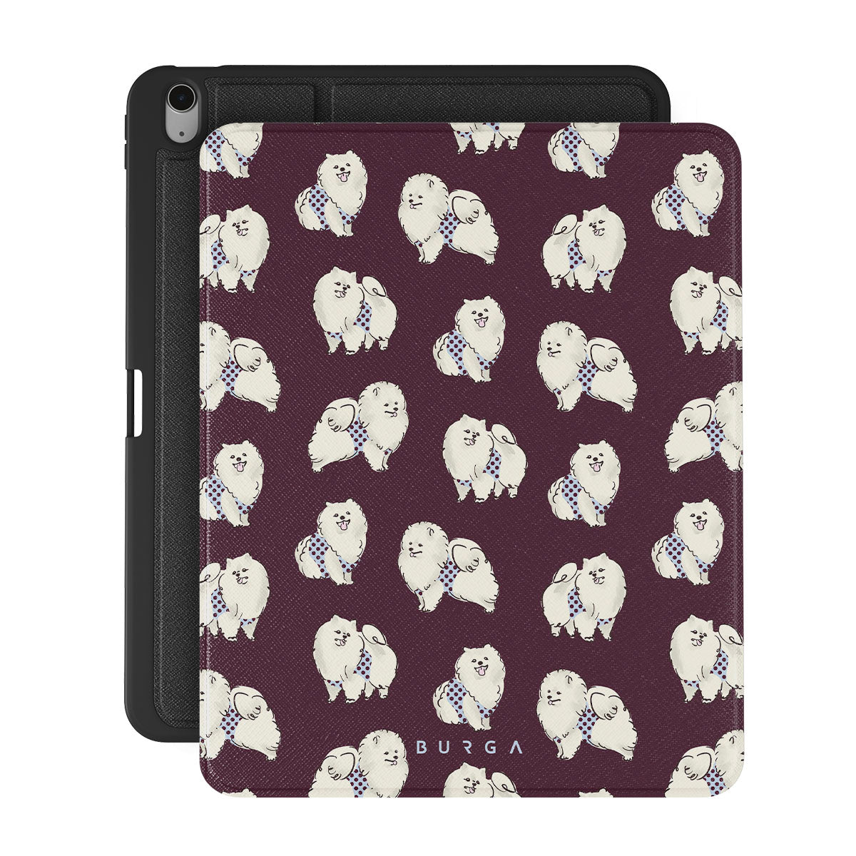 Questo design include: cani bianchi e soffici su uno sfondo bordeaux intenso, barboncini e animali domestici.