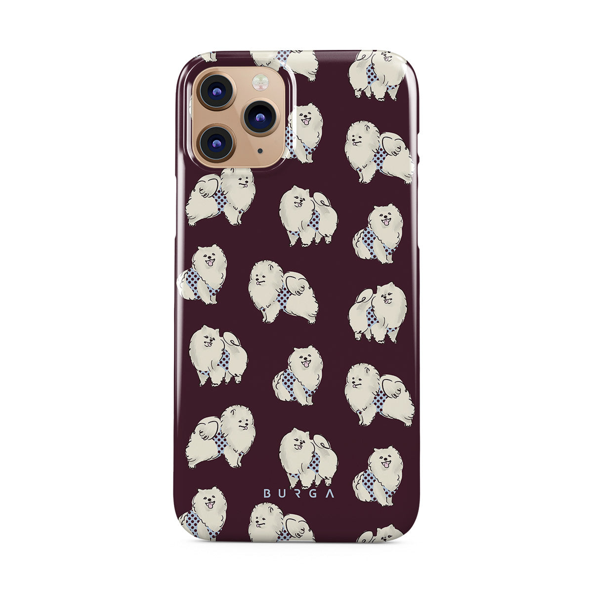 Questo design include: cani bianchi e soffici su uno sfondo bordeaux intenso, barboncini e animali domestici.