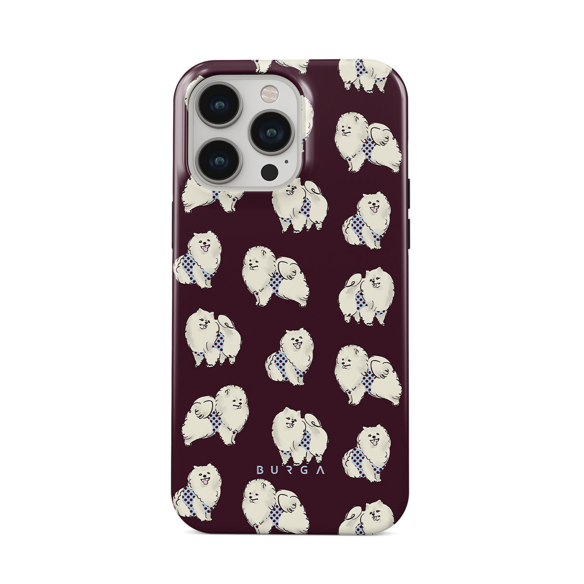 Questo design include: cani bianchi e soffici su uno sfondo bordeaux intenso, barboncini e animali domestici.