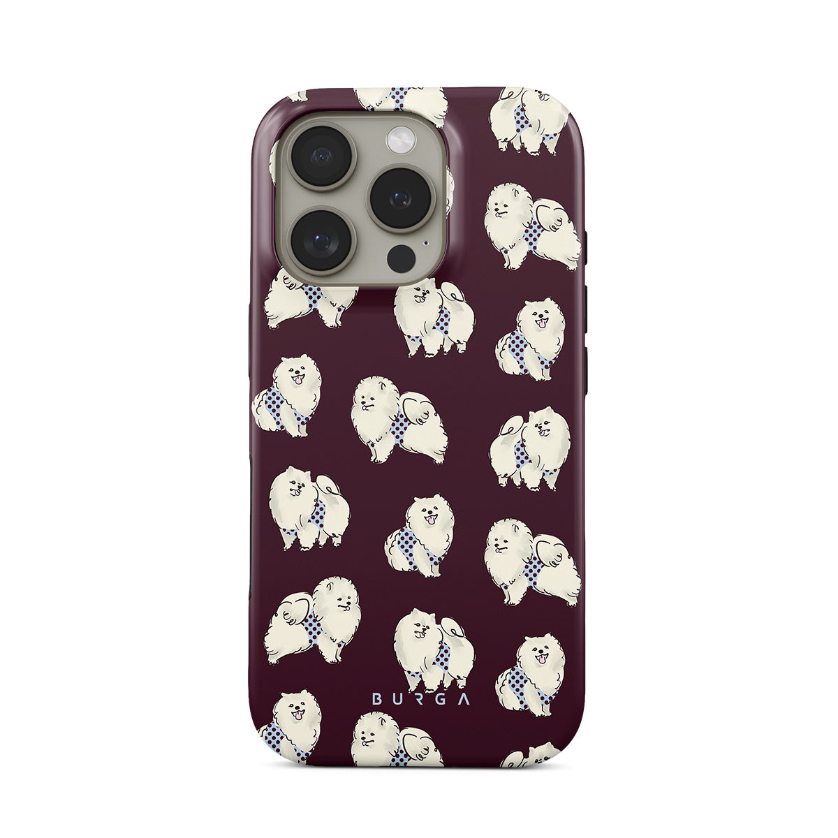 Questo design include: cani bianchi e soffici su uno sfondo bordeaux intenso, barboncini e animali domestici.