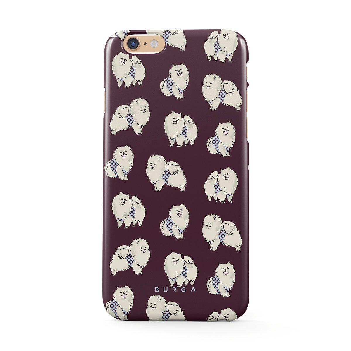 Questo design include: cani bianchi e soffici su uno sfondo bordeaux intenso, barboncini e animali domestici.