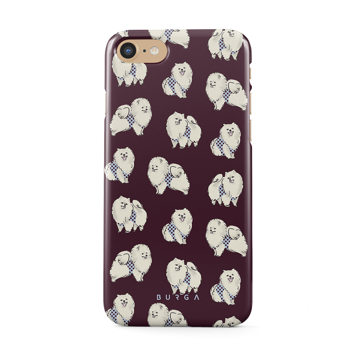 Questo design include: cani bianchi e soffici su uno sfondo bordeaux intenso, barboncini e animali domestici.