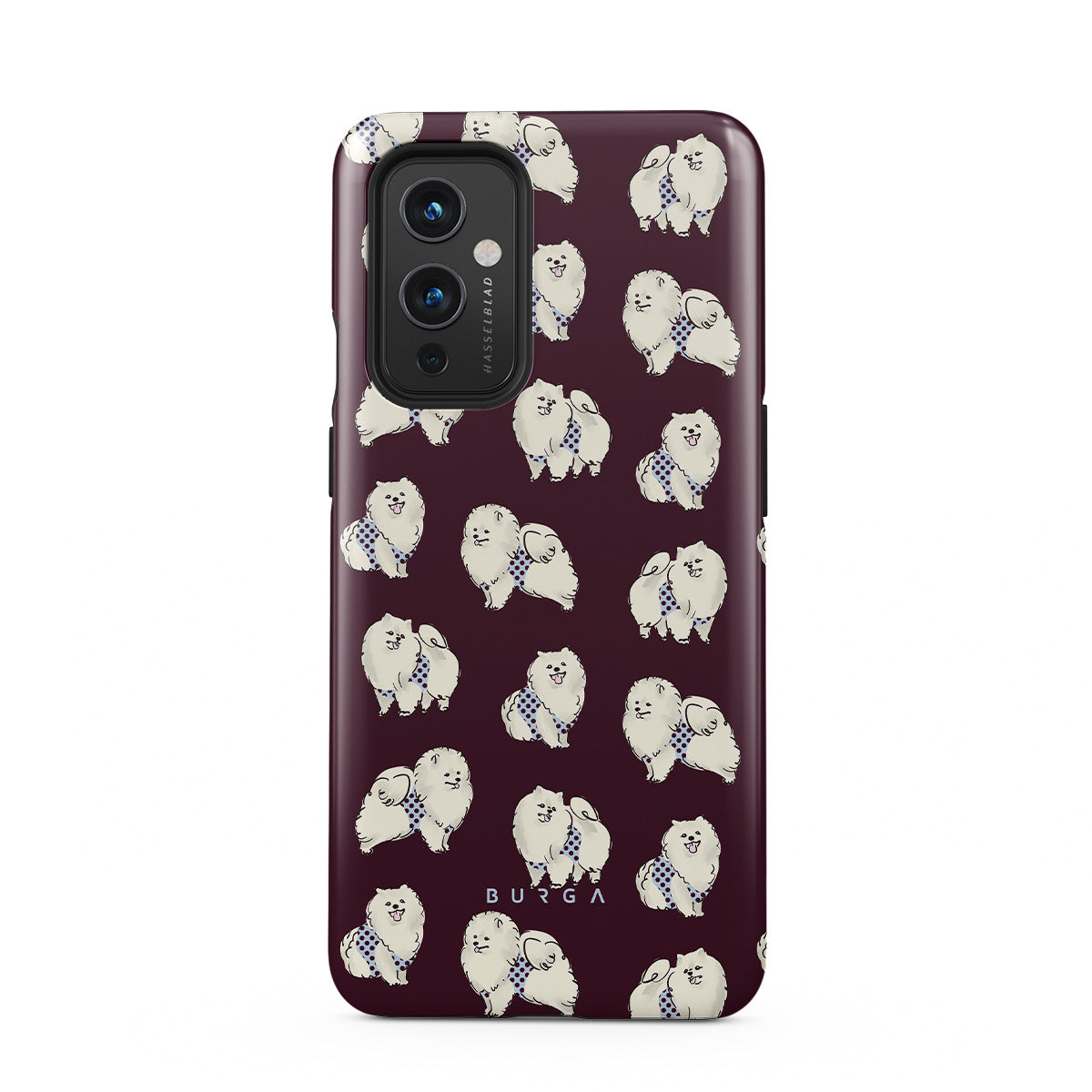 Questo design include: cani bianchi e soffici su uno sfondo bordeaux intenso, barboncini e animali domestici.