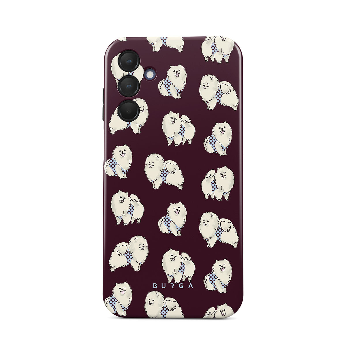 Questo design include: cani bianchi e soffici su uno sfondo bordeaux intenso, barboncini e animali domestici.