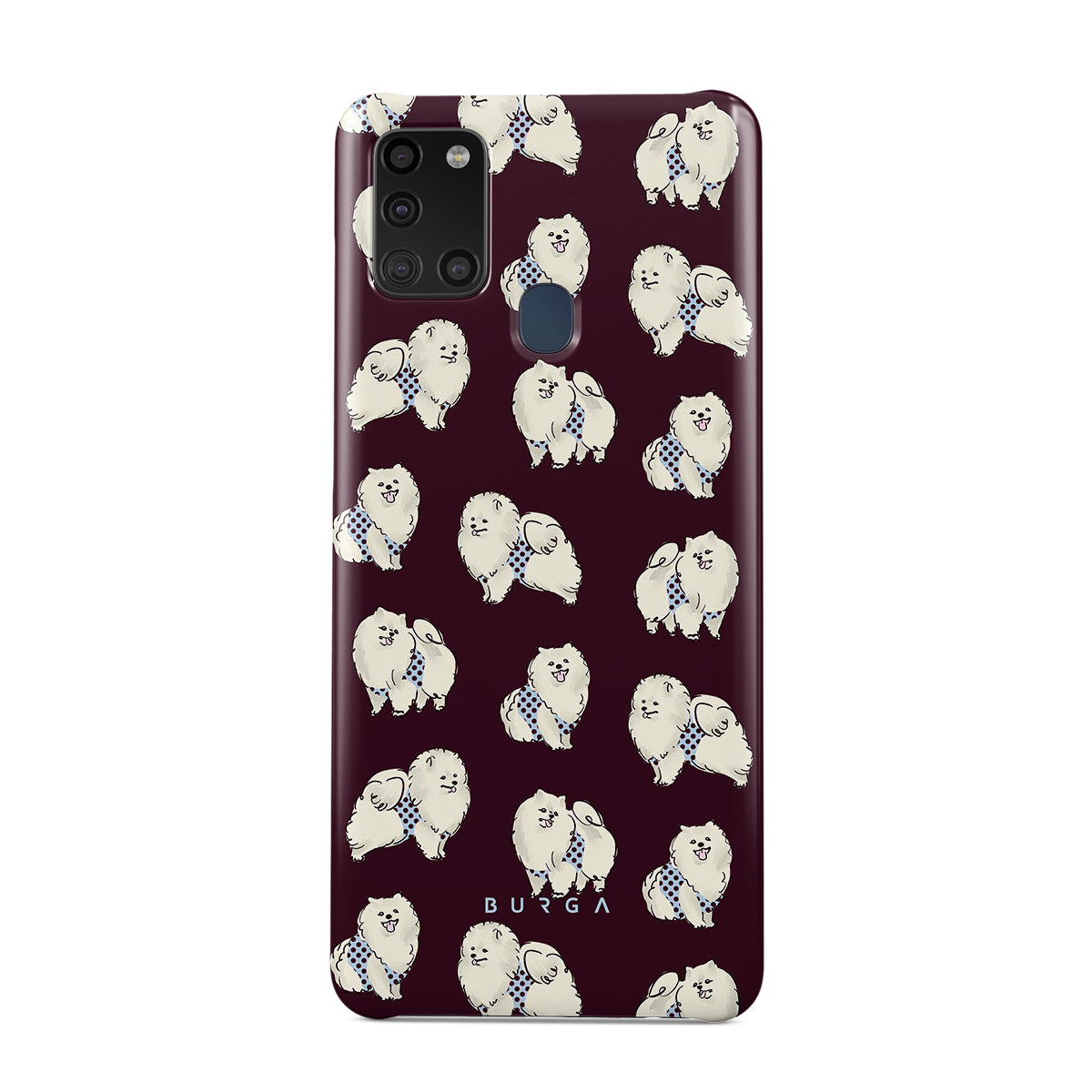 Questo design include: cani bianchi e soffici su uno sfondo bordeaux intenso, barboncini e animali domestici.