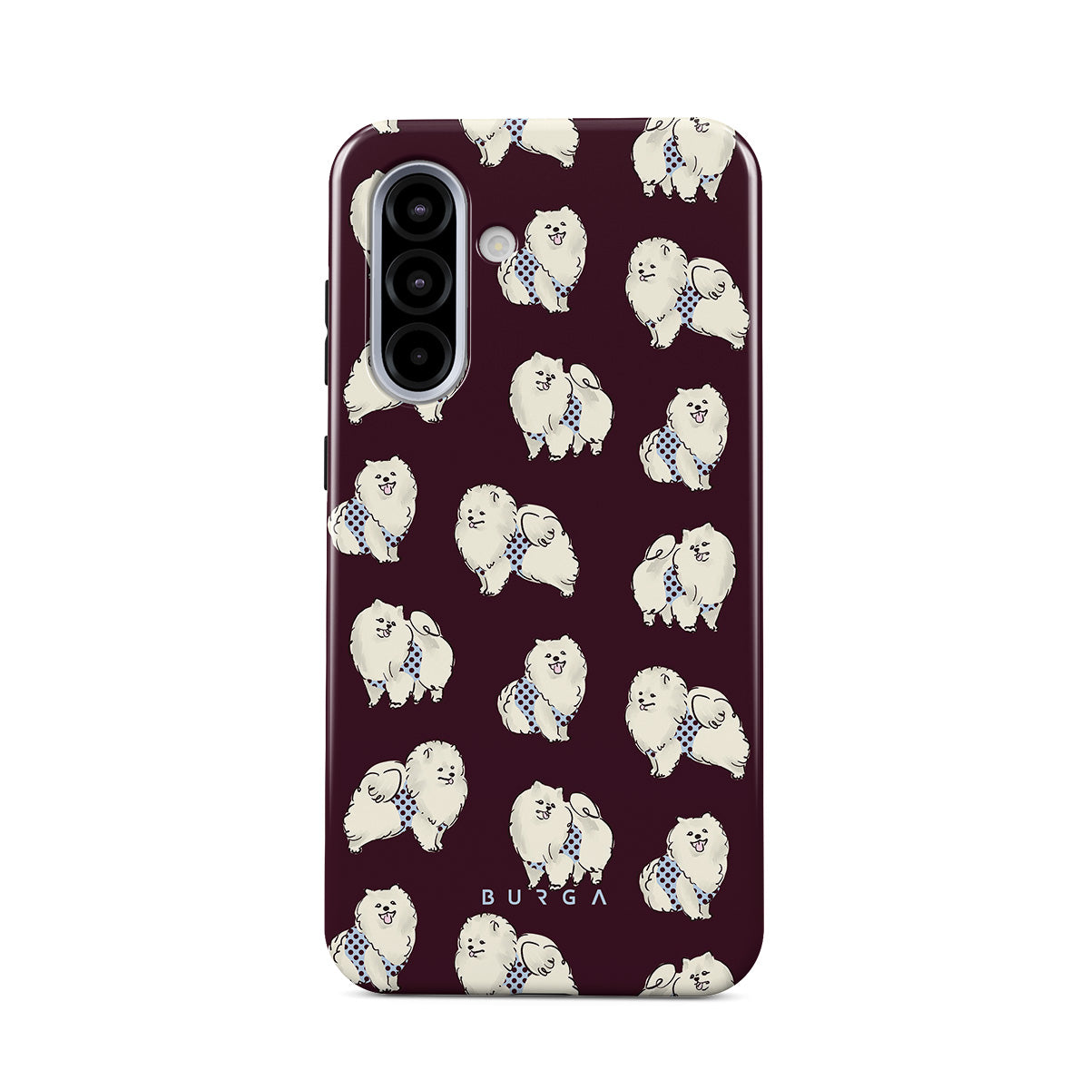 Questo design include: cani bianchi e soffici su uno sfondo bordeaux intenso, barboncini e animali domestici.