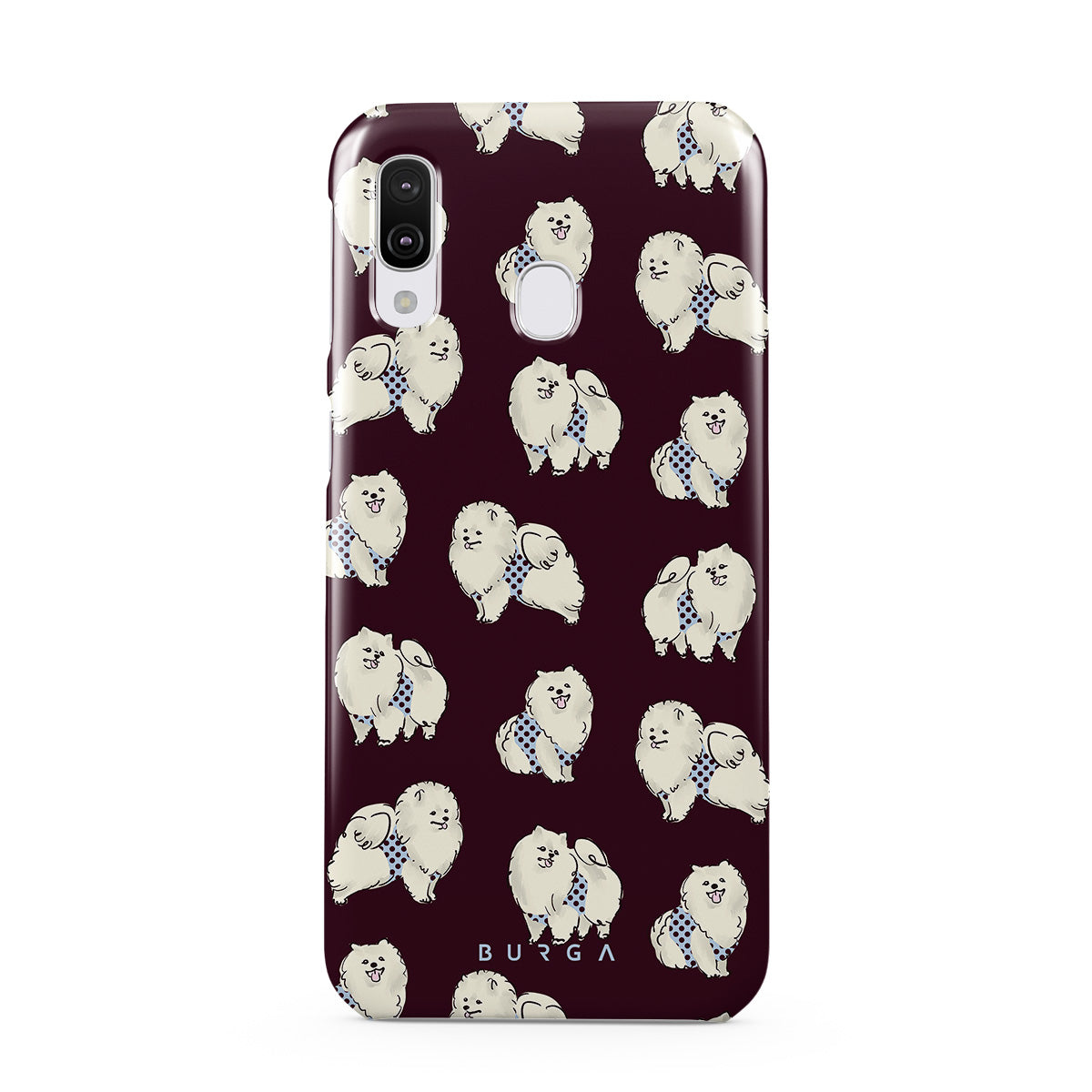 Questo design include: cani bianchi e soffici su uno sfondo bordeaux intenso, barboncini e animali domestici.
