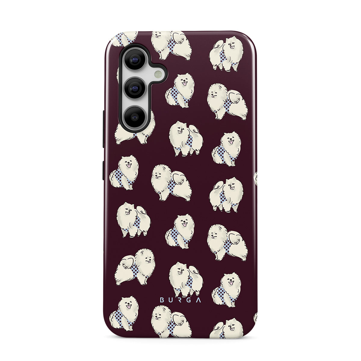 Questo design include: cani bianchi e soffici su uno sfondo bordeaux intenso, barboncini e animali domestici.
