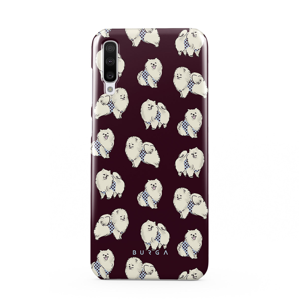 Questo design include: cani bianchi e soffici su uno sfondo bordeaux intenso, barboncini e animali domestici.