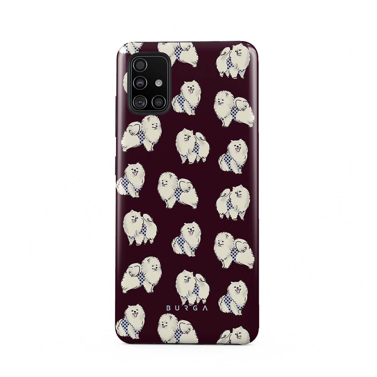 Questo design include: cani bianchi e soffici su uno sfondo bordeaux intenso, barboncini e animali domestici.