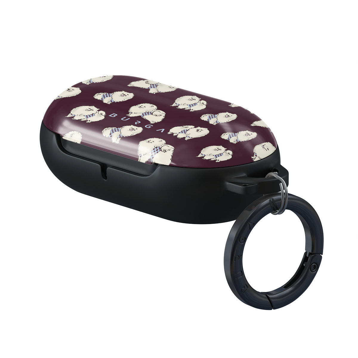 Questo design include: cani bianchi e soffici su uno sfondo bordeaux intenso, barboncini e animali domestici.
