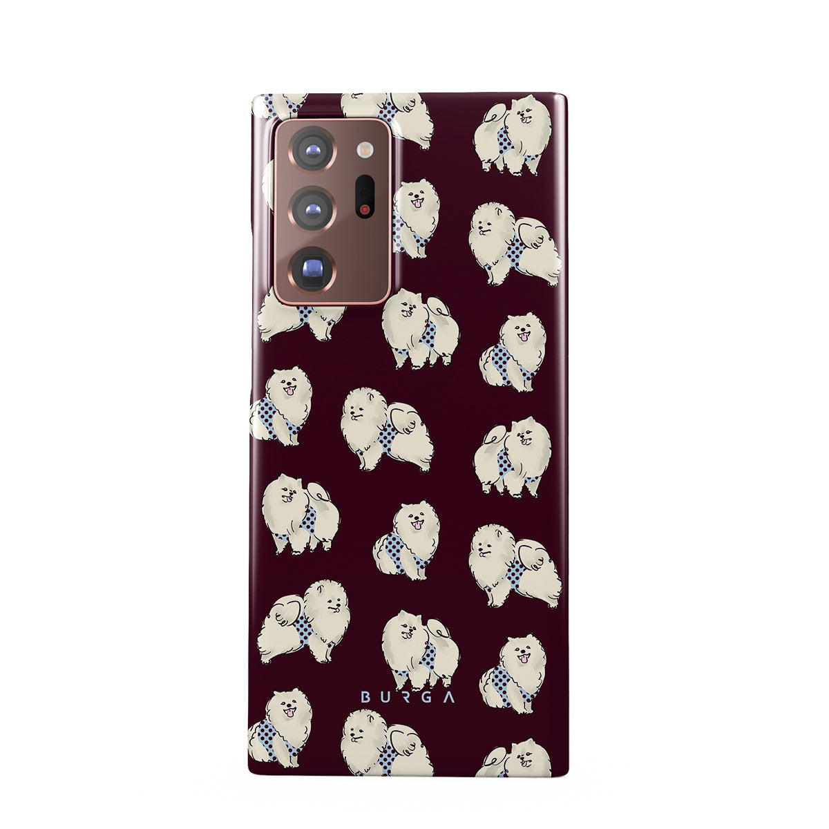 Questo design include: cani bianchi e soffici su uno sfondo bordeaux intenso, barboncini e animali domestici.