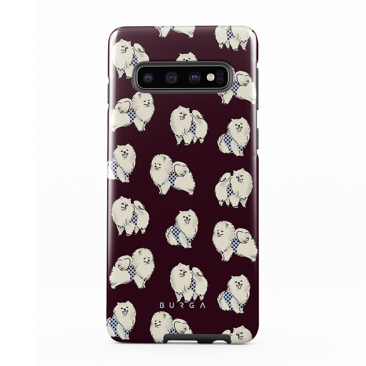 Questo design include: cani bianchi e soffici su uno sfondo bordeaux intenso, barboncini e animali domestici.