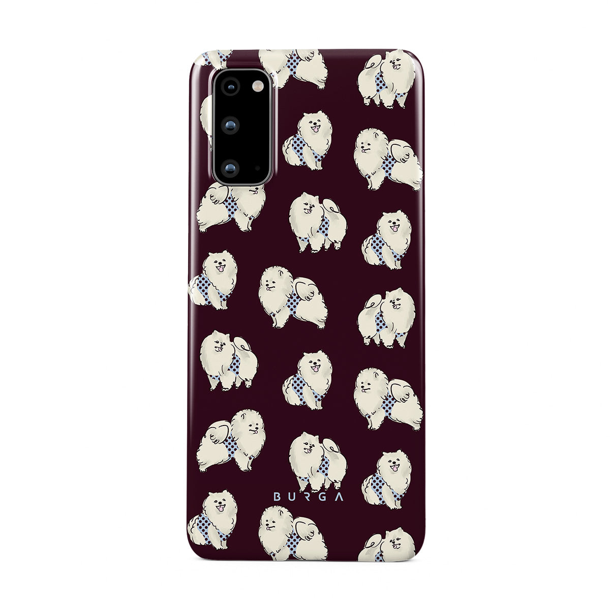 Questo design include: cani bianchi e soffici su uno sfondo bordeaux intenso, barboncini e animali domestici.