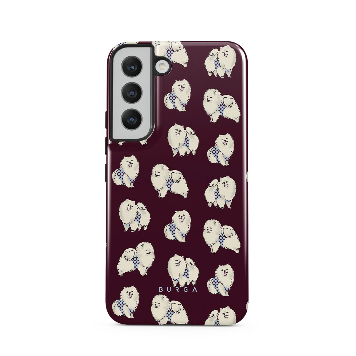 Questo design include: cani bianchi e soffici su uno sfondo bordeaux intenso, barboncini e animali domestici.