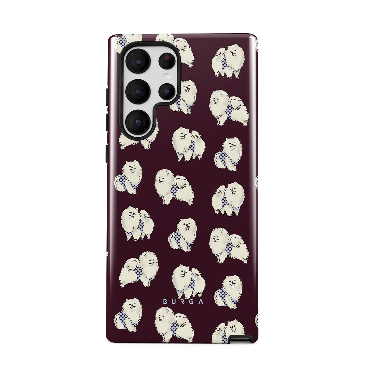 Questo design include: cani bianchi e soffici su uno sfondo bordeaux intenso, barboncini e animali domestici.