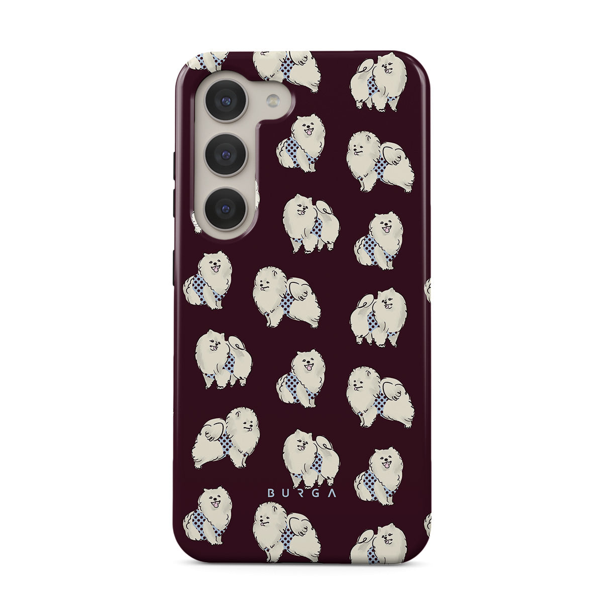 Questo design include: cani bianchi e soffici su uno sfondo bordeaux intenso, barboncini e animali domestici.