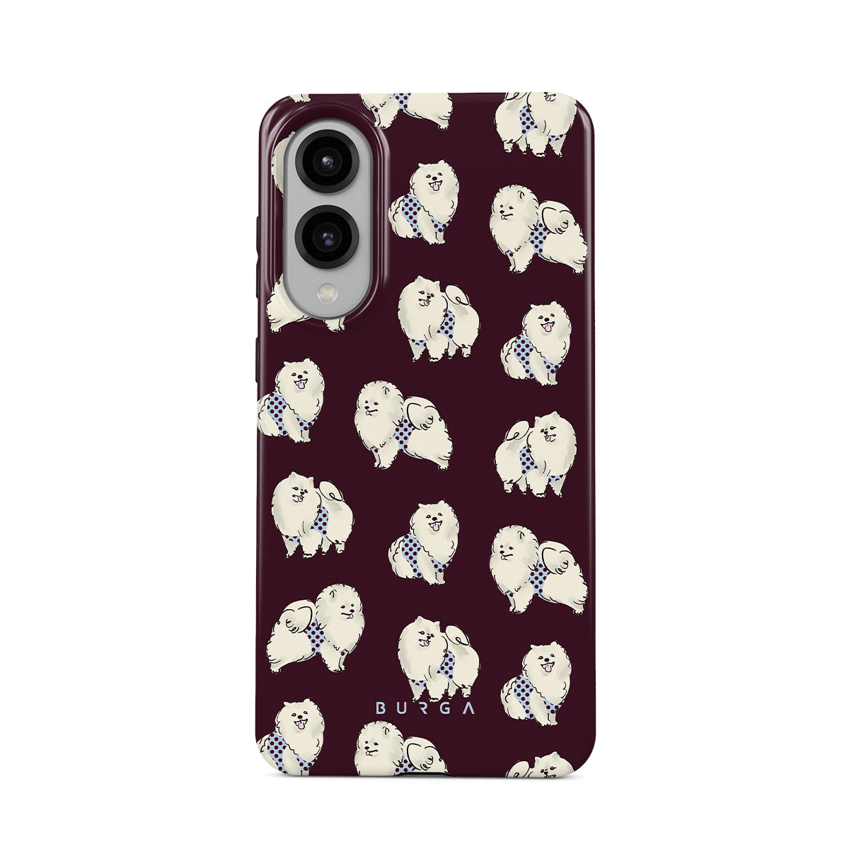 Questo design include: cani bianchi e soffici su uno sfondo bordeaux intenso, barboncini e animali domestici.