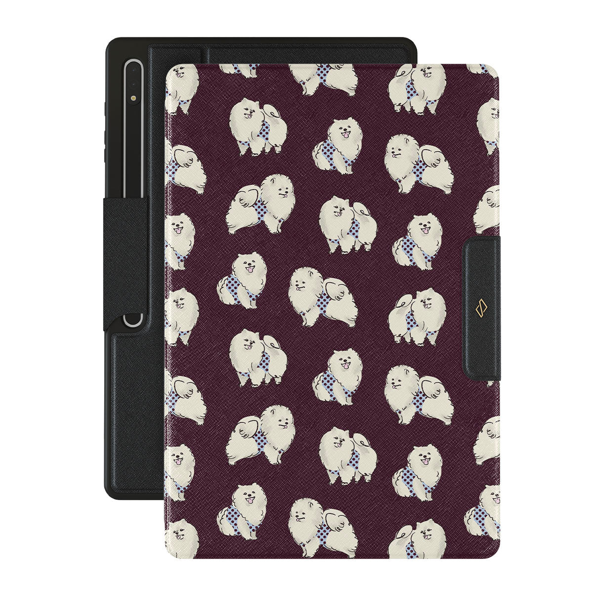 Questo design include: cani bianchi e soffici su uno sfondo bordeaux intenso, barboncini e animali domestici.