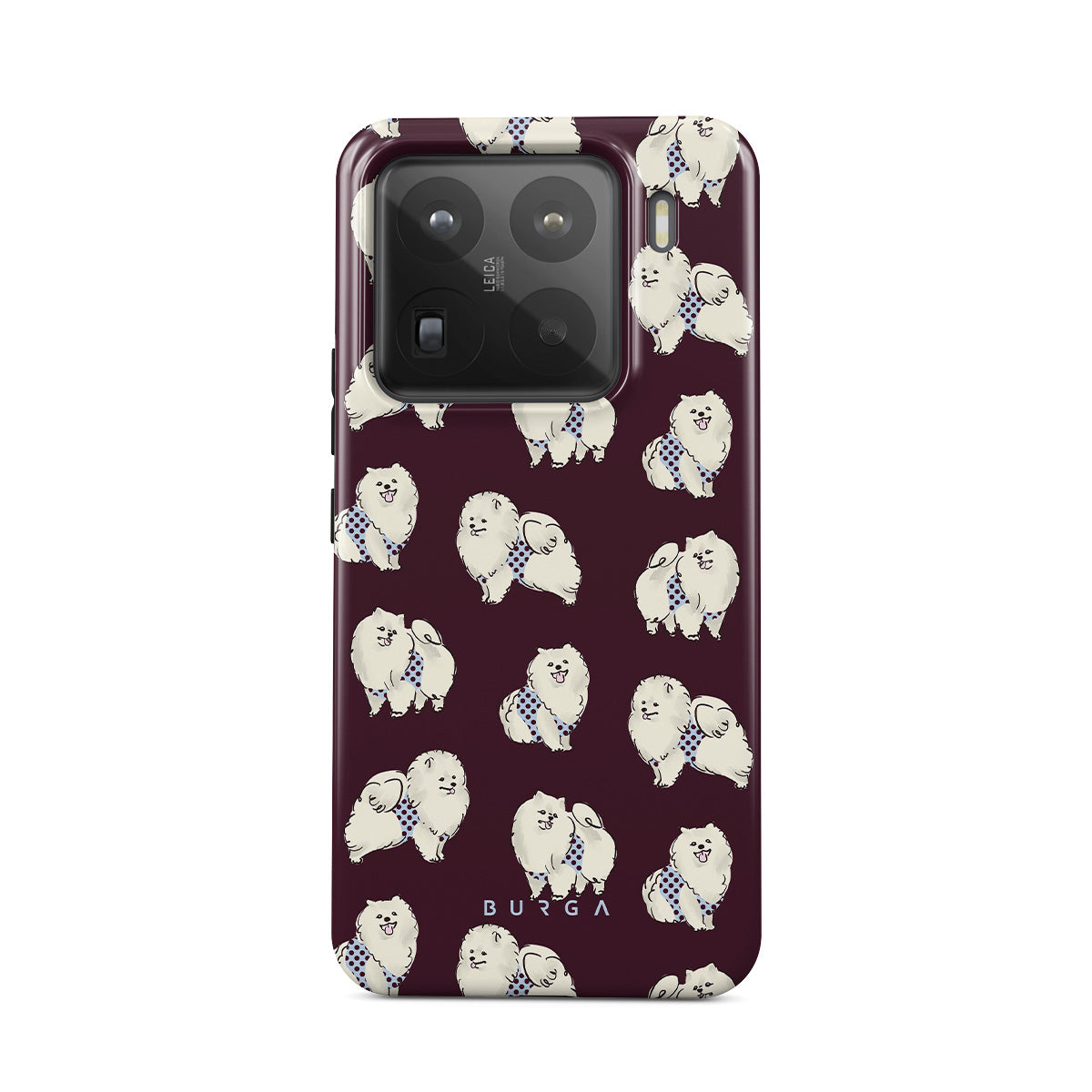 Questo design include: cani bianchi e soffici su uno sfondo bordeaux intenso, barboncini e animali domestici.