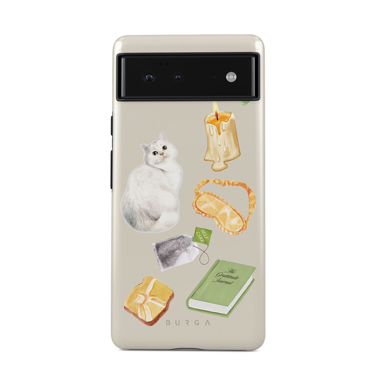 Questo design include: gatto bianco, libro verde, candela, Gua Sha bar, maschera per dormire, bustina di tè, cristallo giallo.
