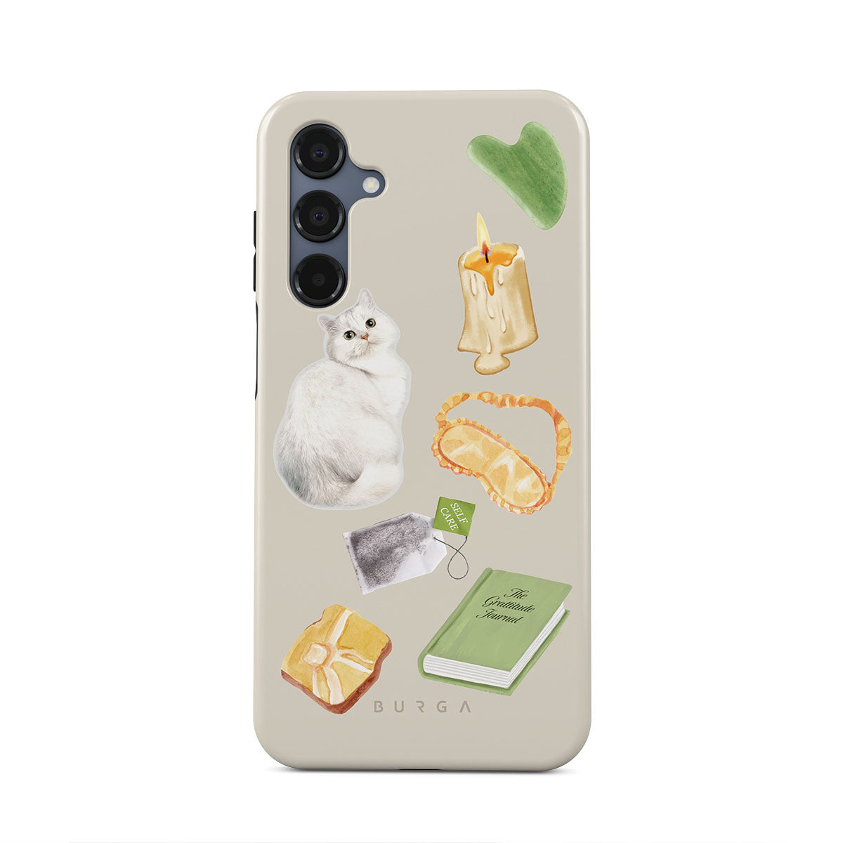 Questo design include: gatto bianco, libro verde, candela, Gua Sha bar, maschera per dormire, bustina di tè, cristallo giallo.