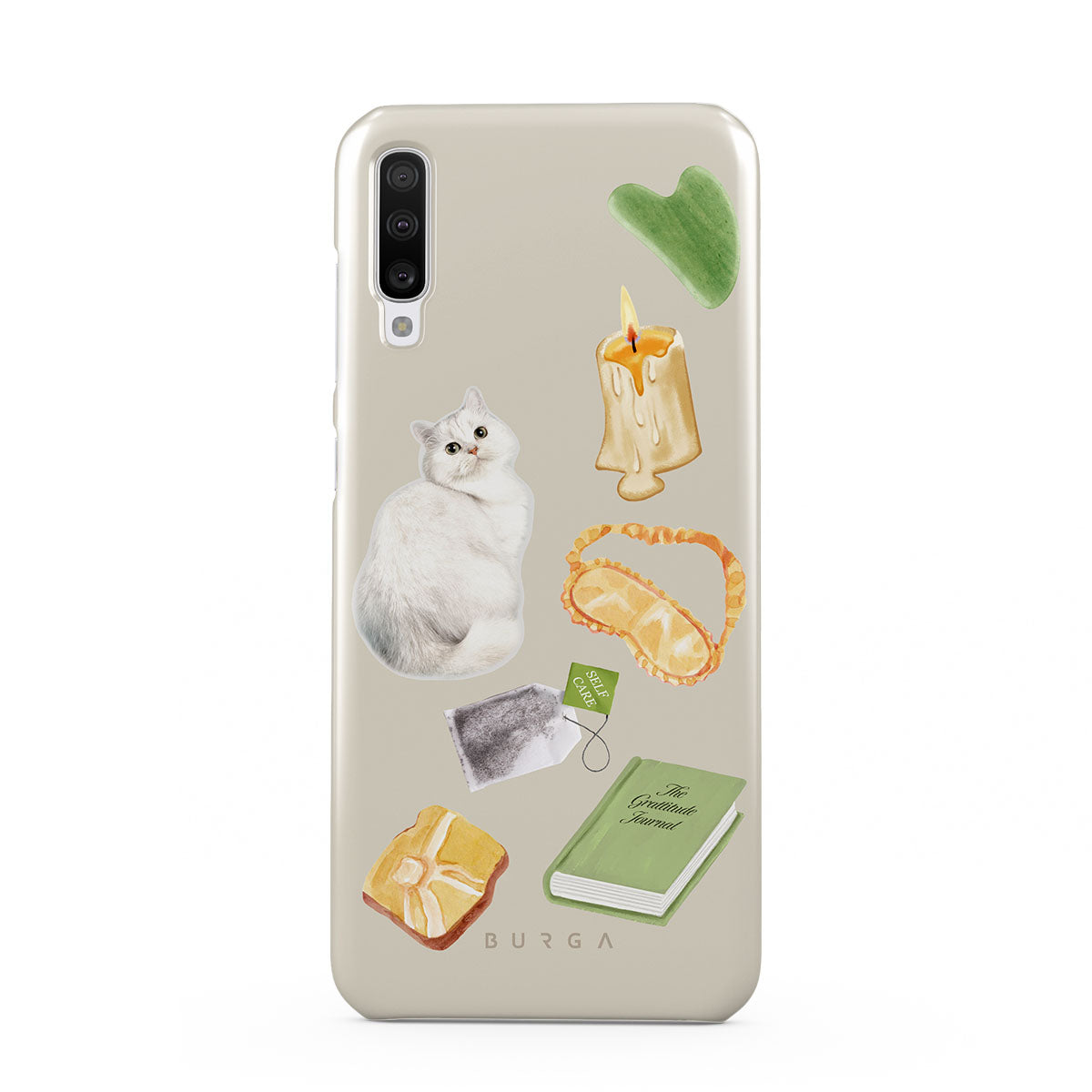 Questo design include: gatto bianco, libro verde, candela, Gua Sha bar, maschera per dormire, bustina di tè, cristallo giallo.