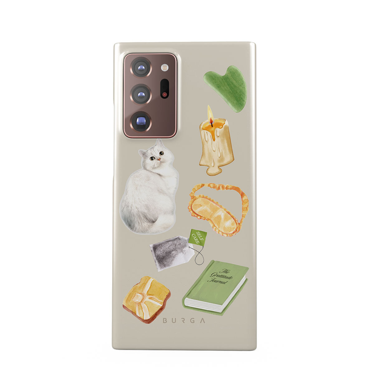 Questo design include: gatto bianco, libro verde, candela, Gua Sha bar, maschera per dormire, bustina di tè, cristallo giallo.
