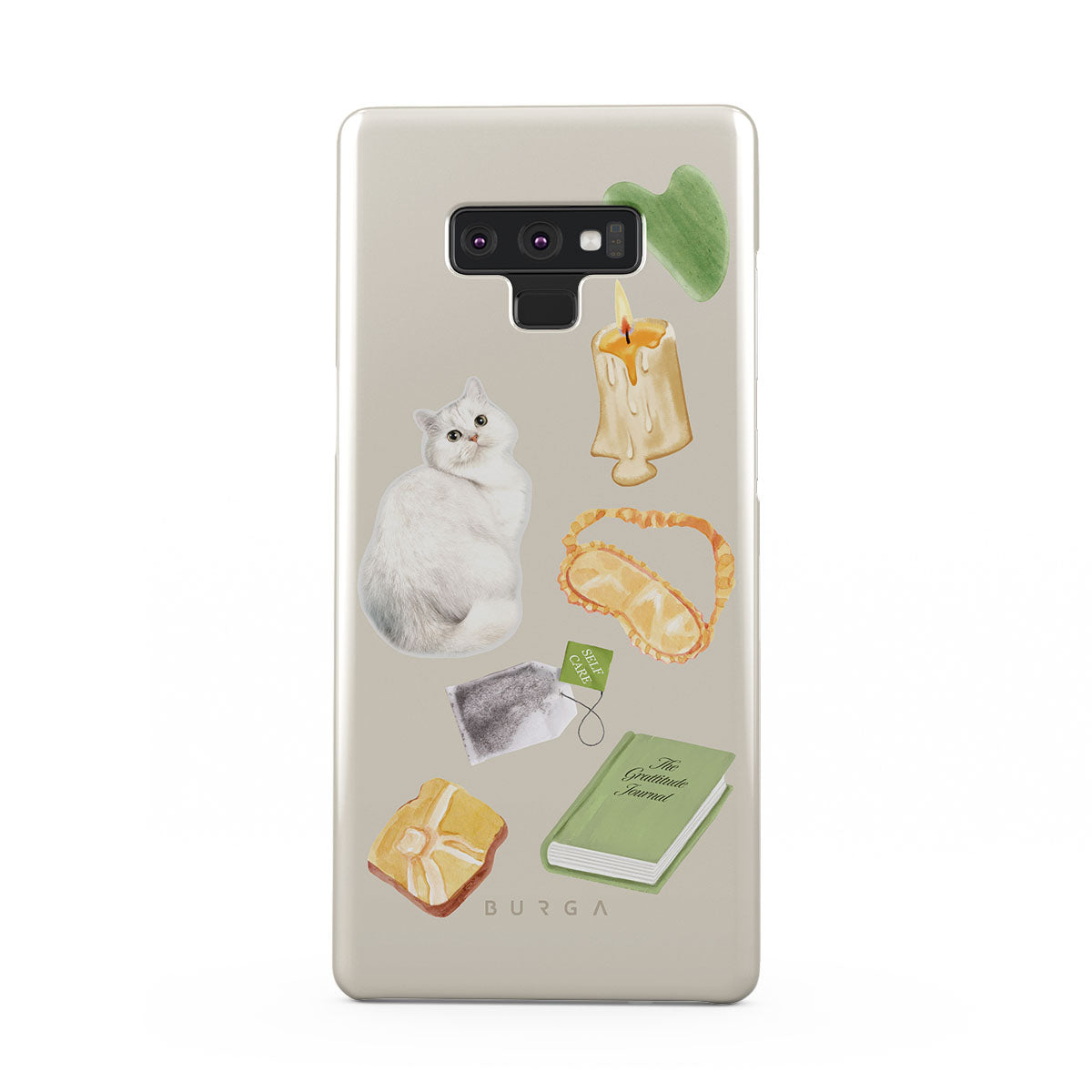 Questo design include: gatto bianco, libro verde, candela, Gua Sha bar, maschera per dormire, bustina di tè, cristallo giallo.