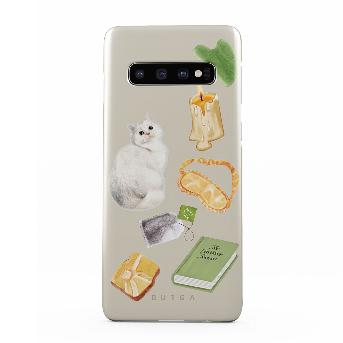 Questo design include: gatto bianco, libro verde, candela, Gua Sha bar, maschera per dormire, bustina di tè, cristallo giallo.
